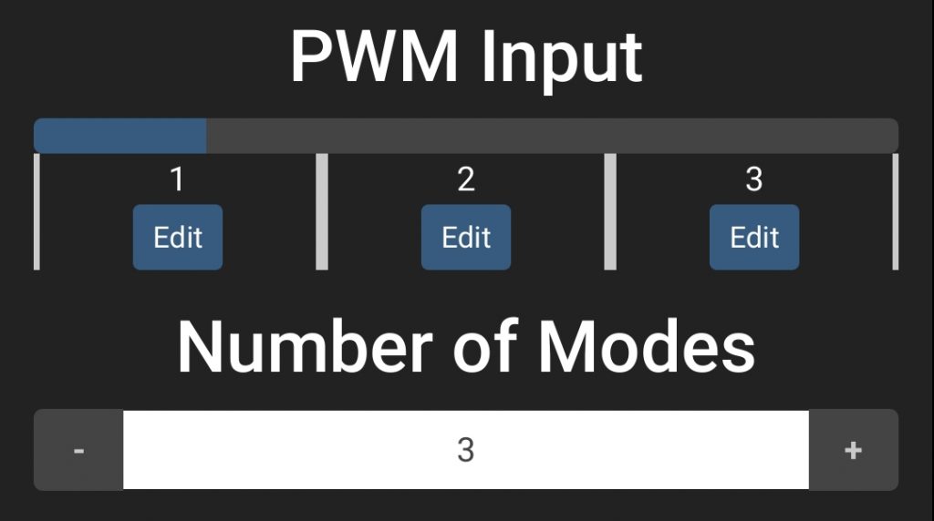 Now we can start the fun stuff! On the main page you will see a blue/grey bar divided into sections (modes). Each mode is a separate LED display, and you can switch between modes using your transmitter. You can change the number of modes available using the + and – buttons pictured. The blue/grey bar will show you the current value being received over PWM. If the value falls inside a particular mode, that mode will be activated.