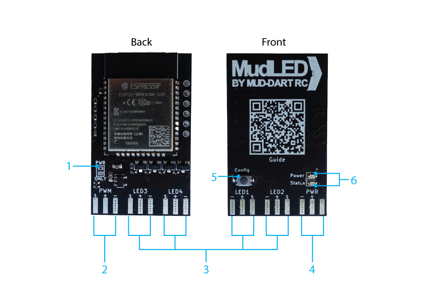 | 2 | PWM Input. Connect your receiver or flight controller here to switch between LED modes. This connector will also power your MudLED board. |