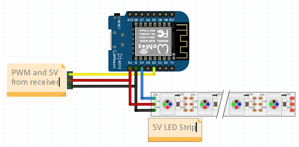OR Since version 1.6.0 you can use the board in multi-strip mode. In this mode you can attach up to 4 LED strsips to D5, D6, D7, and D8 (some extra config required, keep reading).